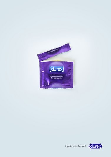 杜蕾斯广告:杜蕾斯的广告一向有创意。此次的平面广告参考了电影的场记板形象,鼓励直奔主题少废话——关灯!Action!